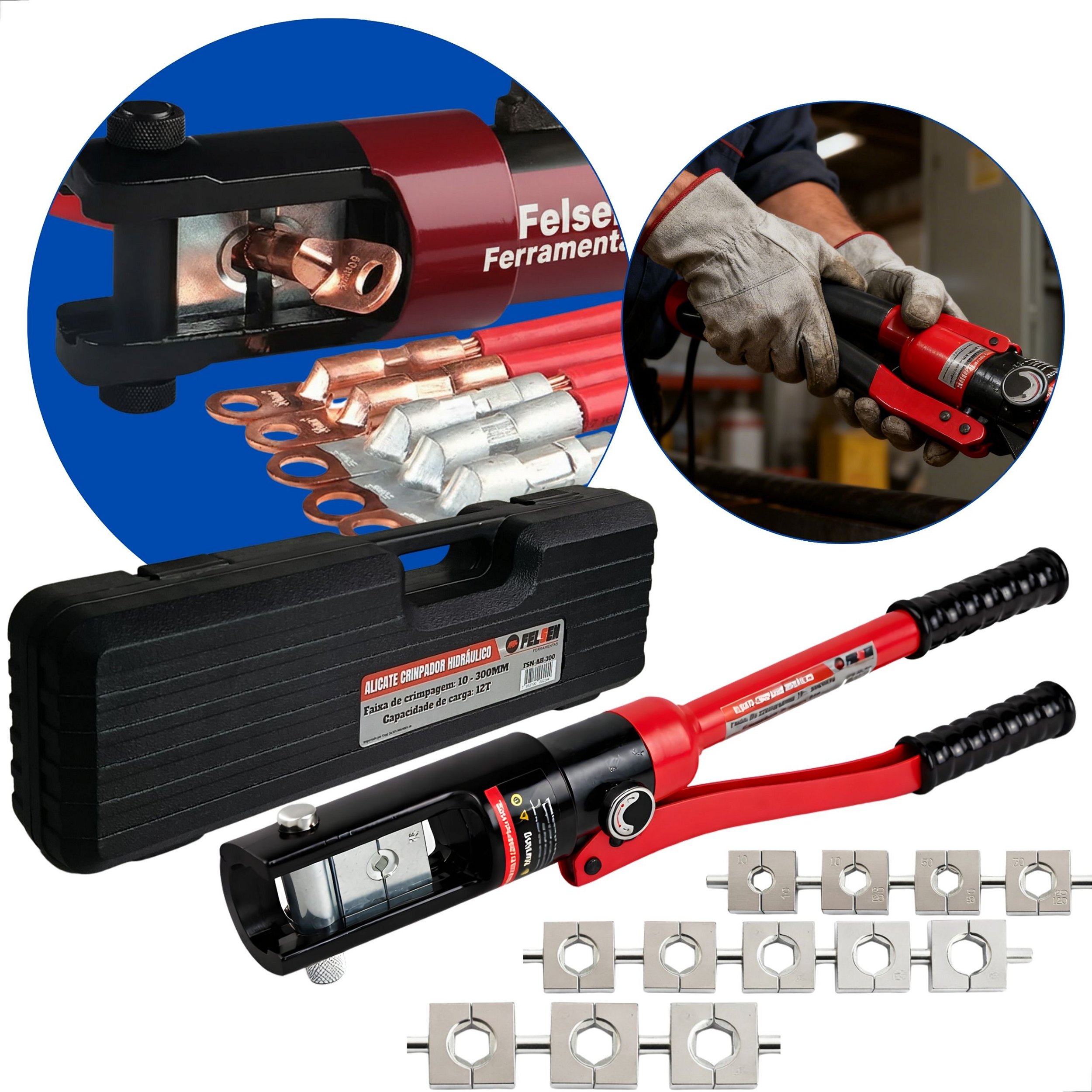 - Matrizes Inclusas: 10-16-25-35-50-70-95-120-150-185-240-300mm² (confirmar se este é o conjunto exato de matrizes que acompanha o produto)