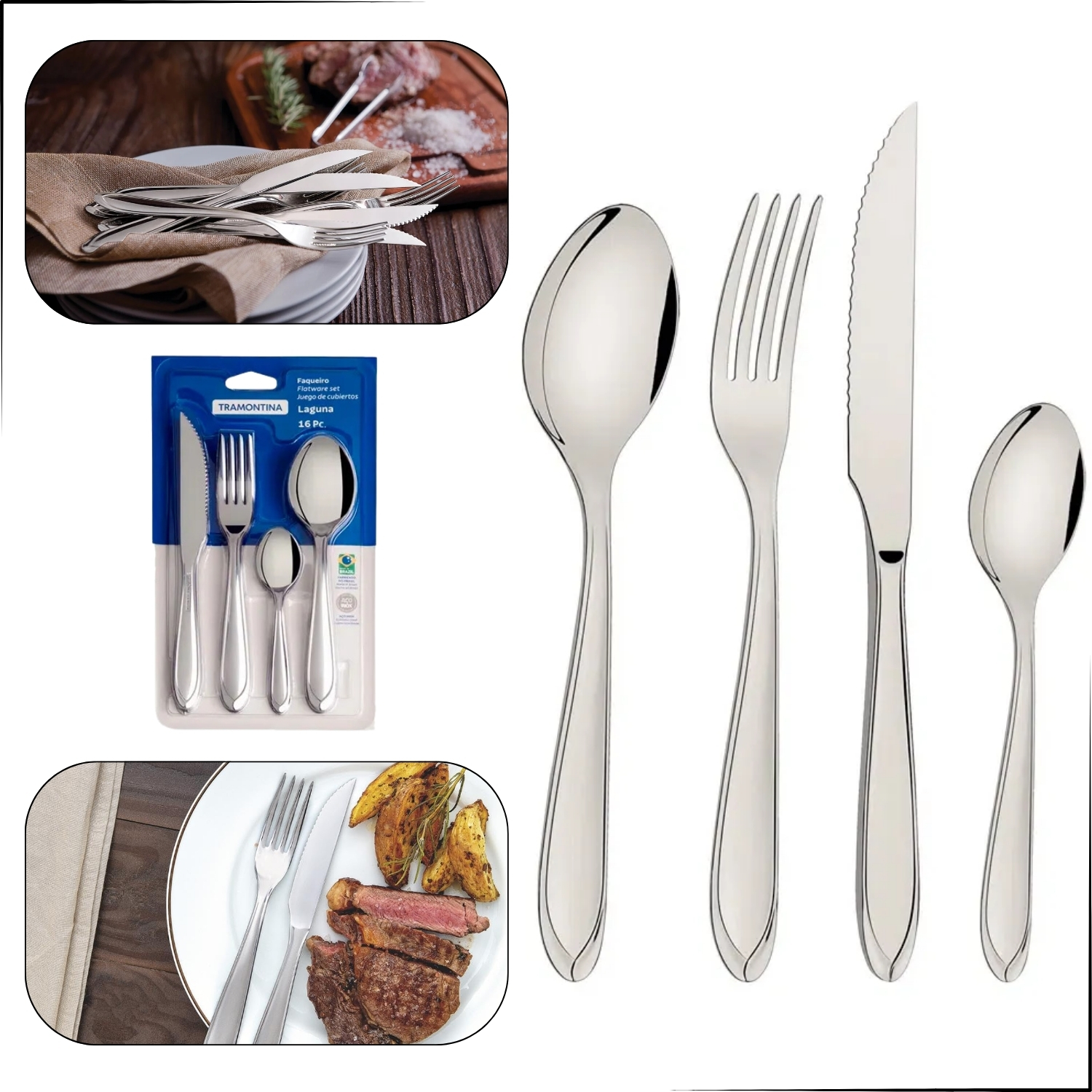 QUE TAL INVESTIR EM ELEGÂNCIA E QUALIDADE PARA A SUA MESA COM O FAQUEIRO LAGUNA 16 PEÇAS TRAMONTINA? COM ACABAMENTO BRILHANTE E DESIGN MODERNO, NÃO PERCA A OPORTUNIDADE DE DEIXAR A SUA MESA AINDA MAIS REQUINTADA E SOFISTICADA.