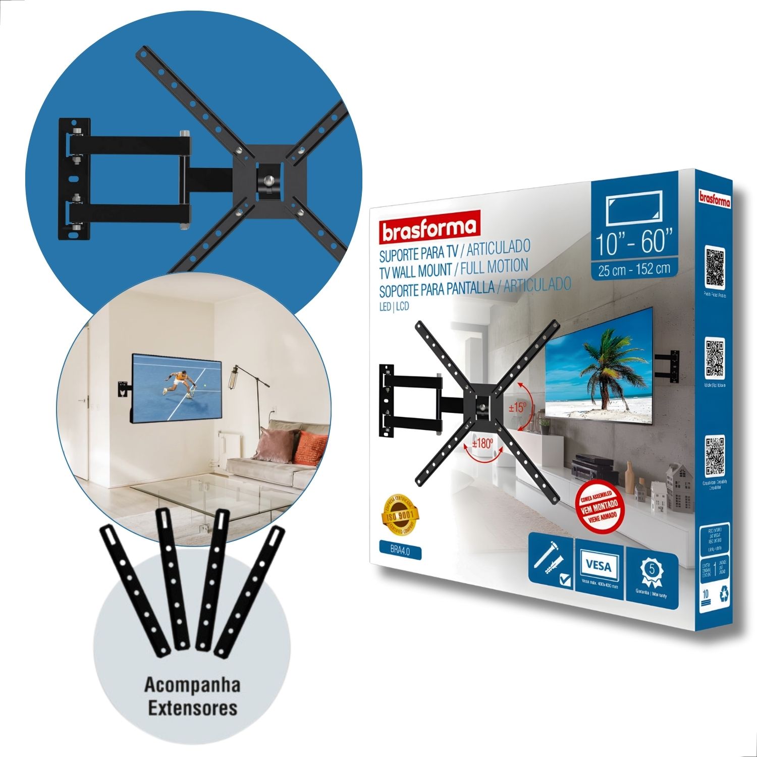Suporte Articulado Brasforma para TVs LCD, LED, Plasma, 3D e Smart TV de 10 até 60 polegadas (com VESA máximo de 400x400mm). Permite articulação de até 180º, inclinação de até 15º e vem montado. Permite Ajustar a TV para assistir de vários ângulos. Ideal para salas, escritórios, quartos, hospitais, restaurantes, entre outros locais.